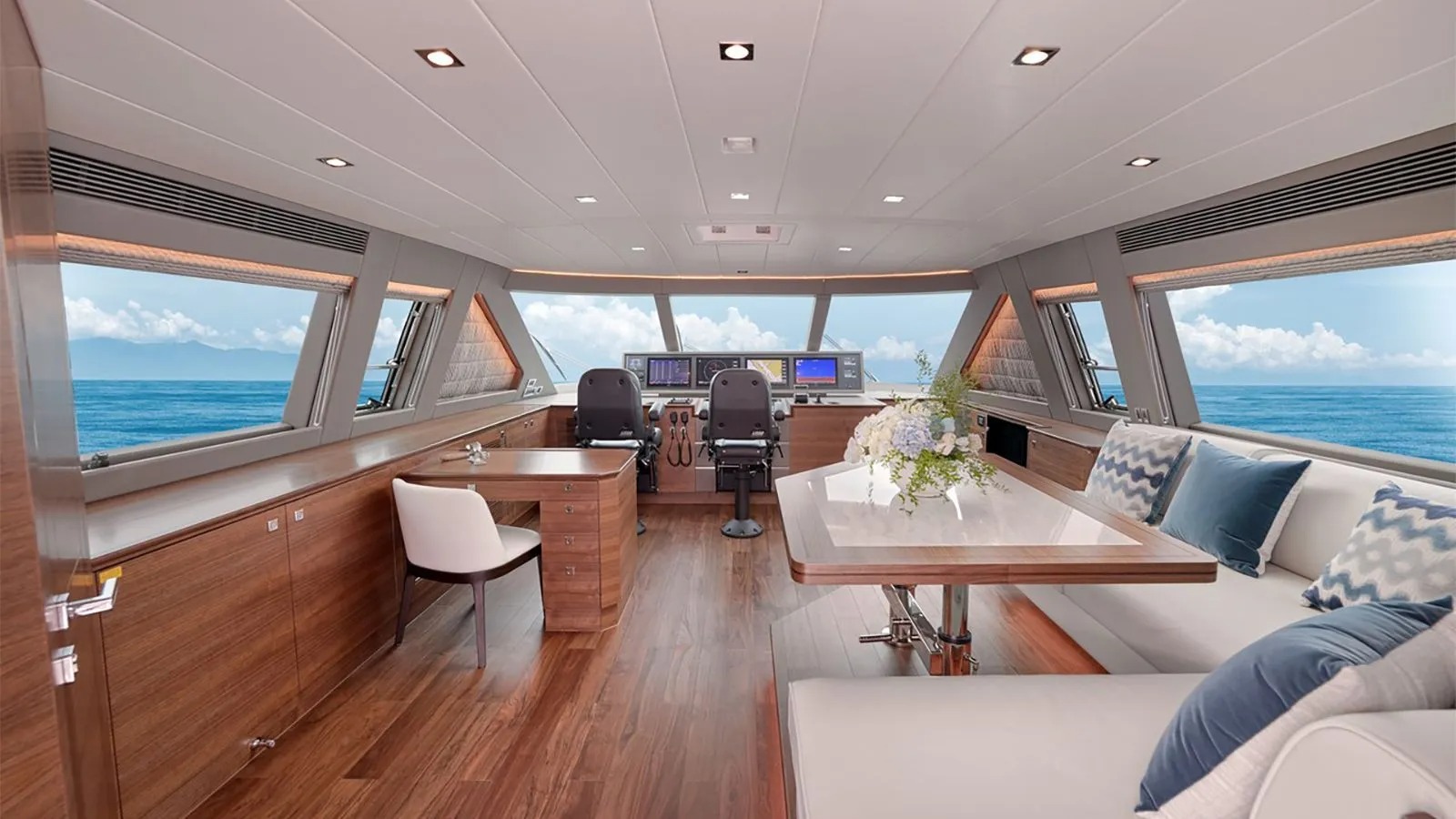 The skylounge is an alternative space for guests to enjoy the far-reaching views while relaxing at the adjustable table and bench seating and interacting with the captain at the helm station.