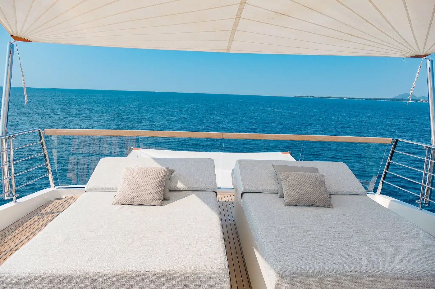 Side walkways lead around to the foredeck, where the bow is fitted with a V-shaped sofa and table for drinks, meals and lounging outdoors in the sunshine with hobbies.