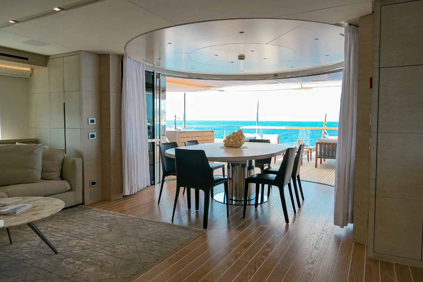 The upper deck aft joins seamlessly with the skylounge for dining alfresco with the glass sliding doors moving out of sight.