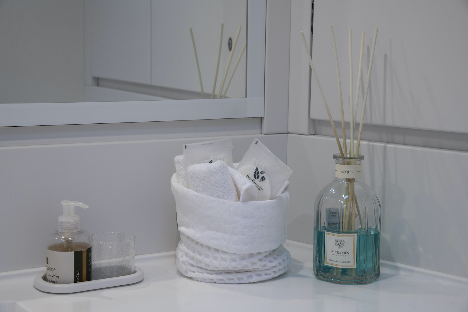 Down the steps from the cockpit into the main salon, guests can relax on the sofas or at the dinette. The space also boasts an open galley forward in the space.