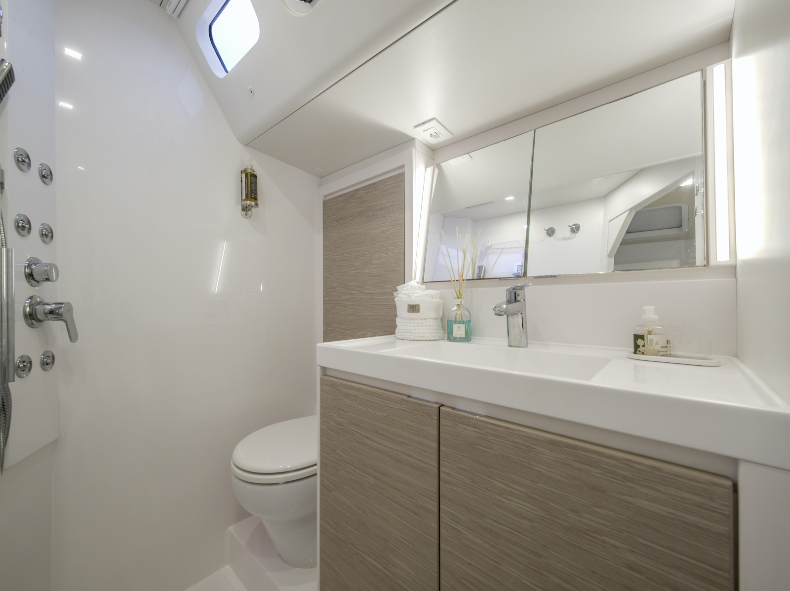 Guests have a choice of three ensuite cabins, one double full beam forward from the main salon, one double aft to port and one twin cabin aft to starboard. Tender 3.10m, outboard motor 15HP + electric motor, paddle board, ...