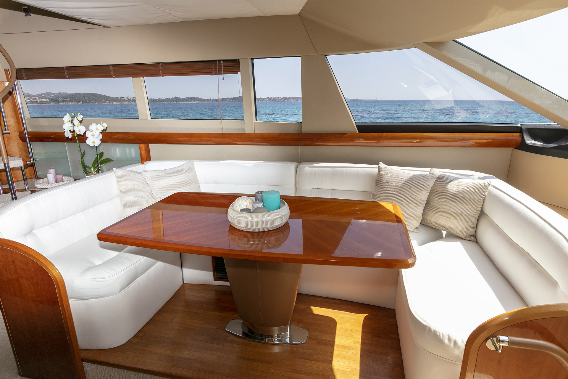 The refined décor on show in the main salon creates a light and comfortable space which flows from the aft deck doors through to the forward helm controls.