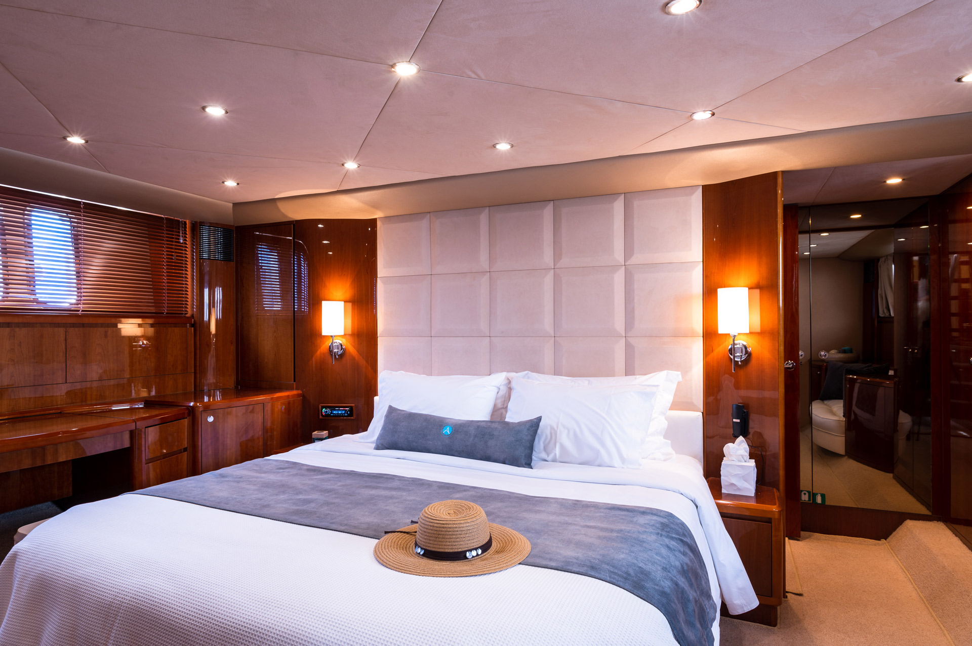 The traditional cabins are located on the lower deck and are configured as: one Master Cabin with king size bed and ensuite; one VIP full beam cabin with king size bed and ensuite; one Double cabin with double bed; and one Twin cabin with one single bed and one bunk bed. The double cabin and twin cabin share bathroom facilities.