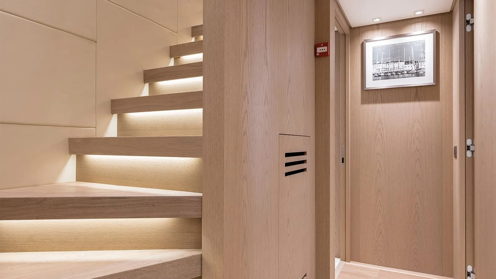 The interior is a cool and stylish blend of mid-tone wooden floors, neutral soft furnishings and lots of light from the huge windows and subtle lighting scheme.