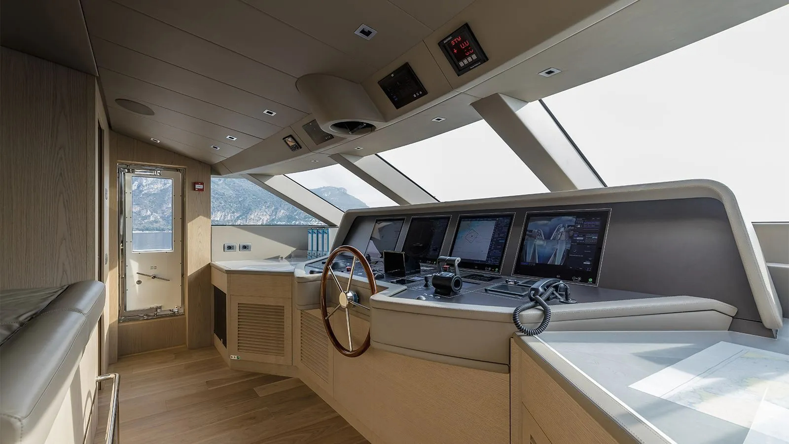 The flybridge has a covered area with a bar and jacuzzi and open uncovered space with sun loungers aft.