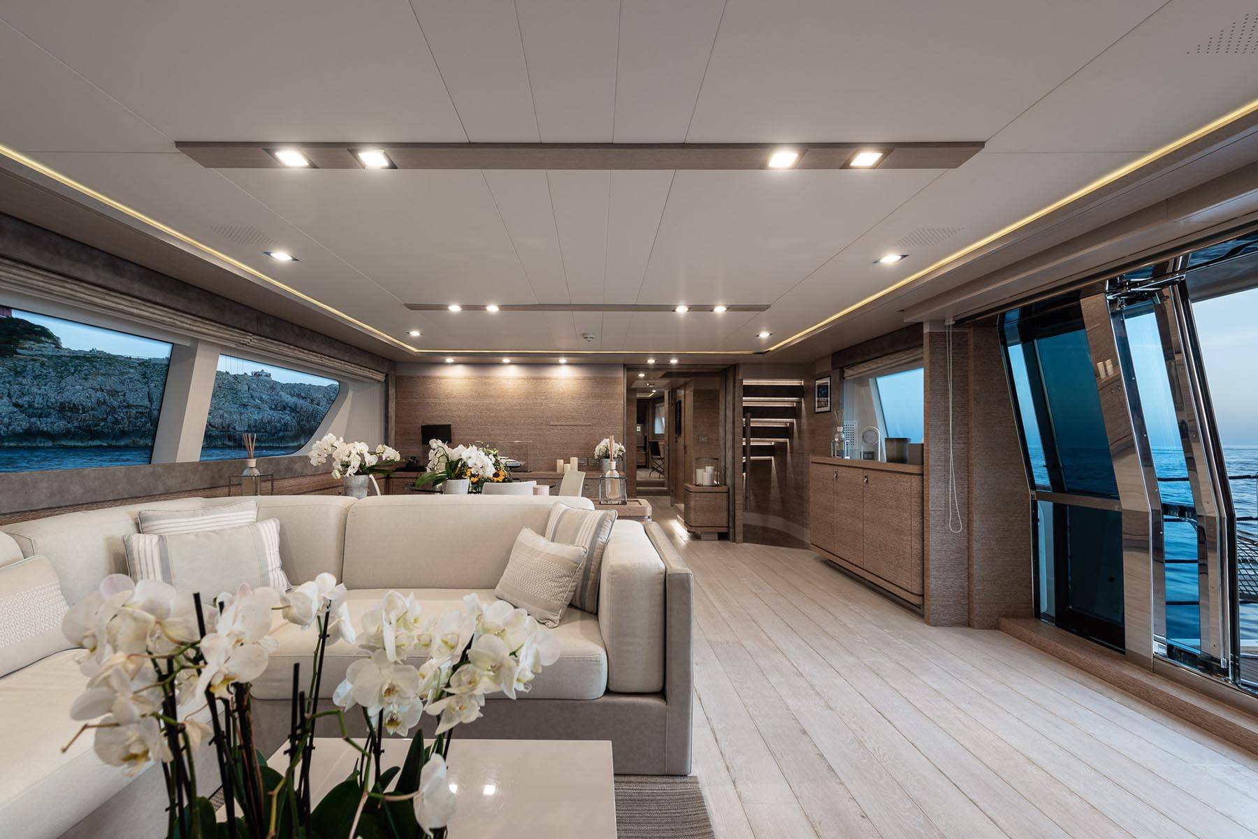 The main deck boasts a splendid fold out balcony to starboard which leads from the dining area in the main salon. The main deck aft is where the crew can serve guests a wonderful al fresco lunch or dinner sheltered under the roof but with amazing views.