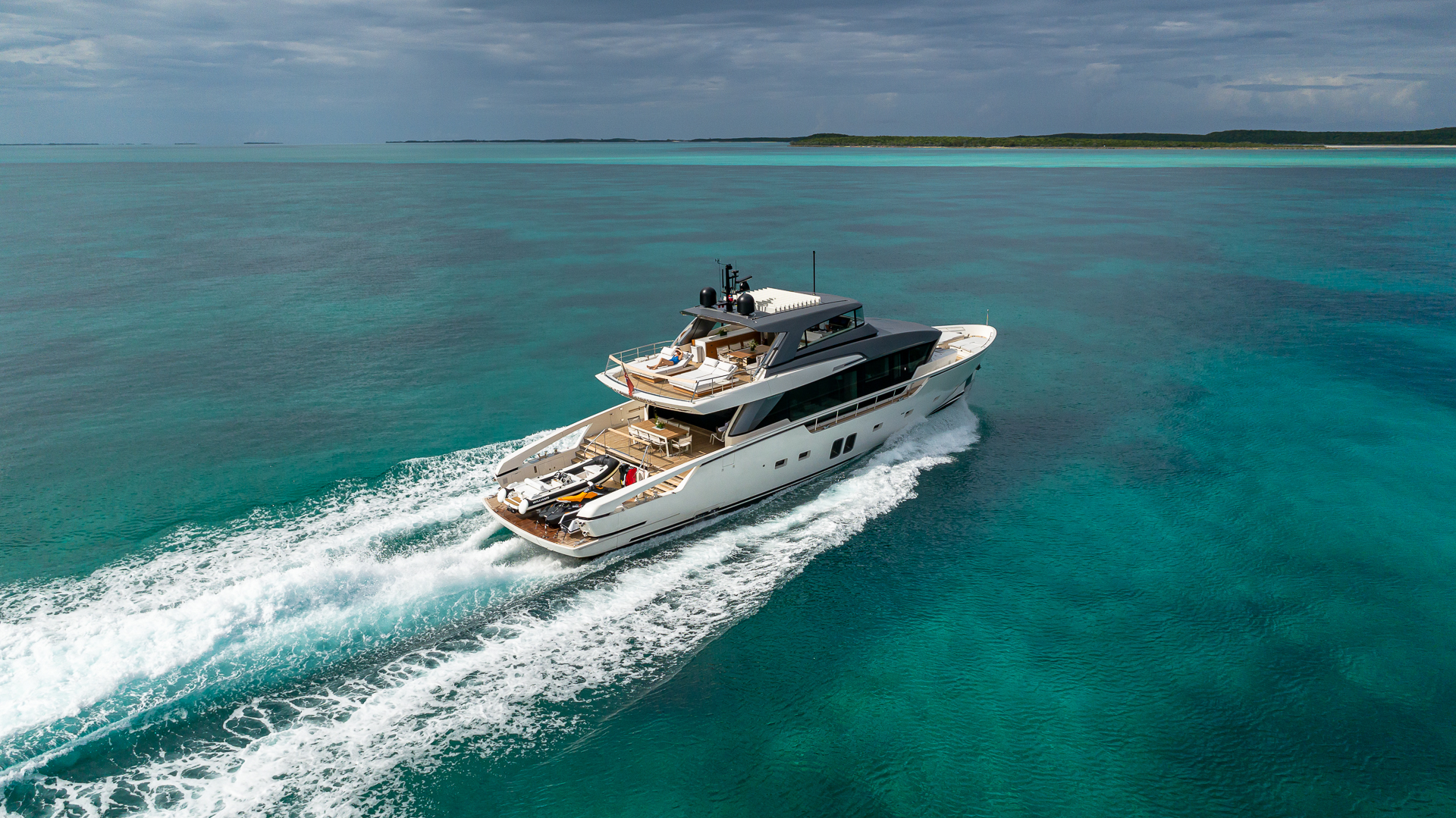 The flybridge is the perfect location for guests to hang out during the day either on the luxury sun loungers, enjoying lunch on the extremely comfortable dining setting or sat with the captain at the helm station. The area is covered by a hard bimini but can be opened using the louvred sunroof.
