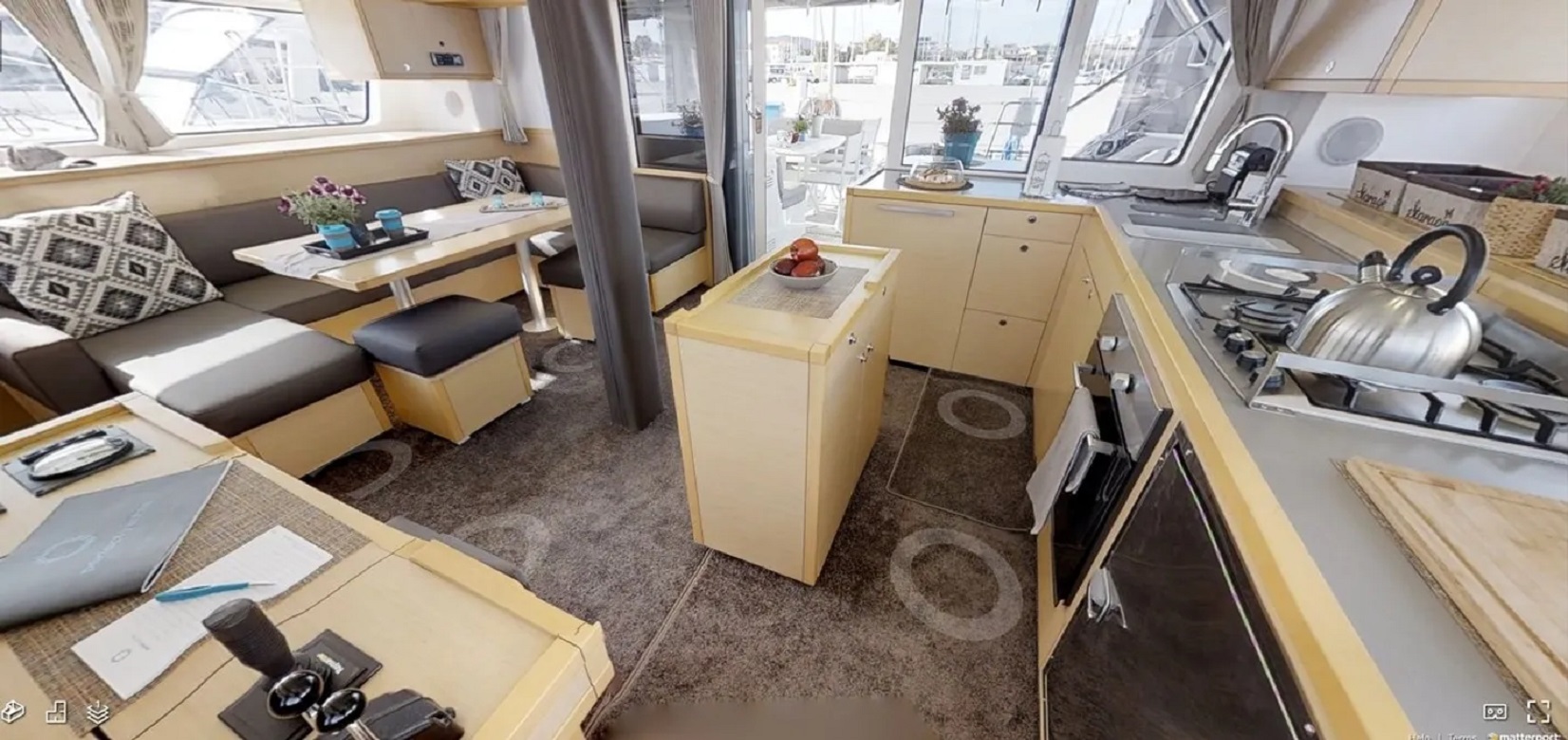 The main salon is a light filled space thanks to the surrounding windows and comprises a well-equipped galley and convertible seating either for dining or relaxation.