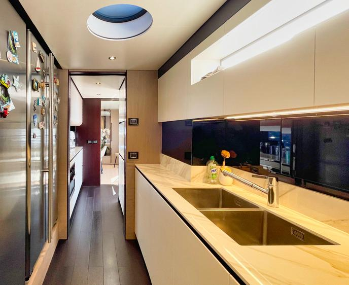Two stairways lead down to the lower deck swim platform and the tender garage, and a port staircase on the main deck aft connects to the flybridge above. The foredeck dining and sunbathing area is accessed via the side walkways ...