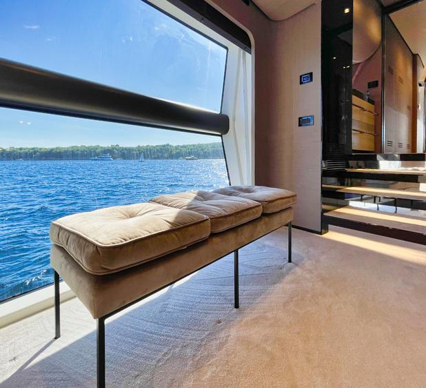 Motor yacht WAVE measures 26.78m (87’86’’) and was built by the Italian shipyard Azimut Yachts in 2019. Her elegant interiors were created by Salvagni Architetti, with striking exterior lines by Stefano Righini. She can accommodate up to ten charter guests in five cabins, with an onboard crew of four.