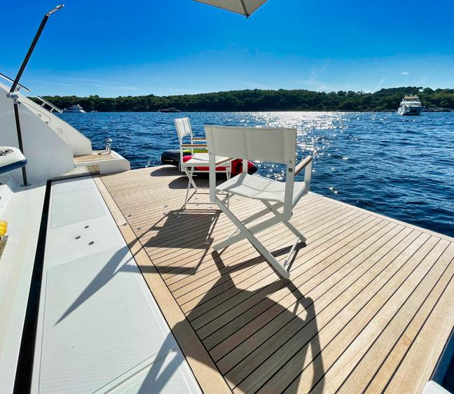 Two stairways lead down to the lower deck swim platform and the tender garage, and a port staircase on the main deck aft connects to the flybridge above. The foredeck dining and sunbathing area is accessed via the side walkways ...