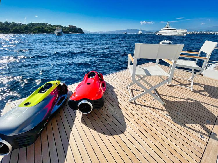 Two stairways lead down to the lower deck swim platform and the tender garage, and a port staircase on the main deck aft connects to the flybridge above. The foredeck dining and sunbathing area is accessed via the side walkways ...