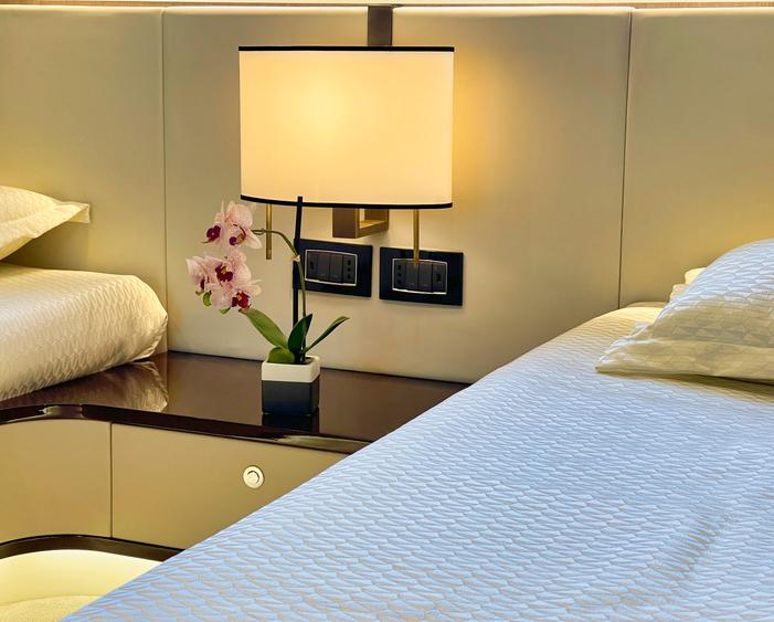Motor yacht WAVE measures 26.78m (87’86’’) and was built by the Italian shipyard Azimut Yachts in 2019. Her elegant interiors were created by Salvagni Architetti, with striking exterior lines by Stefano Righini. She can accommodate up to ten charter guests in five cabins, with an onboard crew of four.