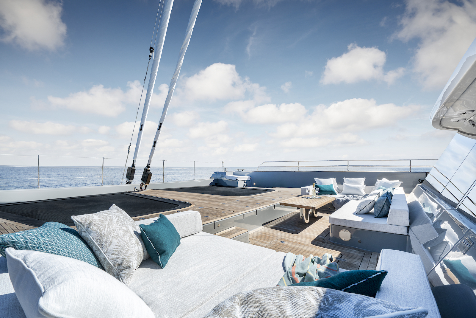 The foredeck terrace boasts comfortable seating around the coffee table, while sun pads are arranged forward adjacent to the two trampolines. The aft deck houses the cockpit with al fresco dining table and flexible seating, plus sun pads which can be converted into a sofa.