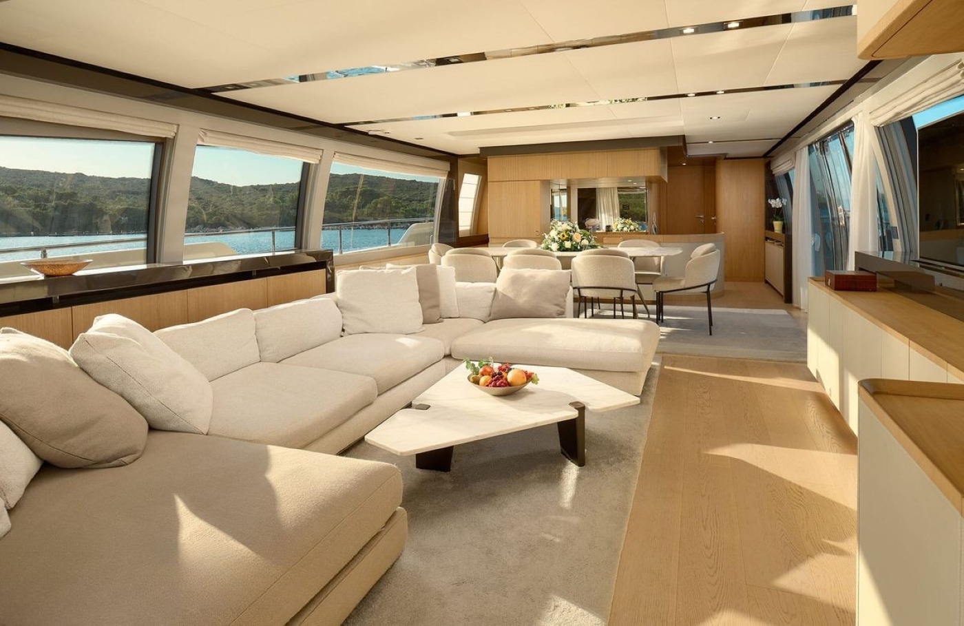 The formal dining area and salon are combined into one open-plan space. The dining area to port seats up to 8 guests in a bright and refined contemporary environment and a glass sliding door to starboard for a more alfresco experience.