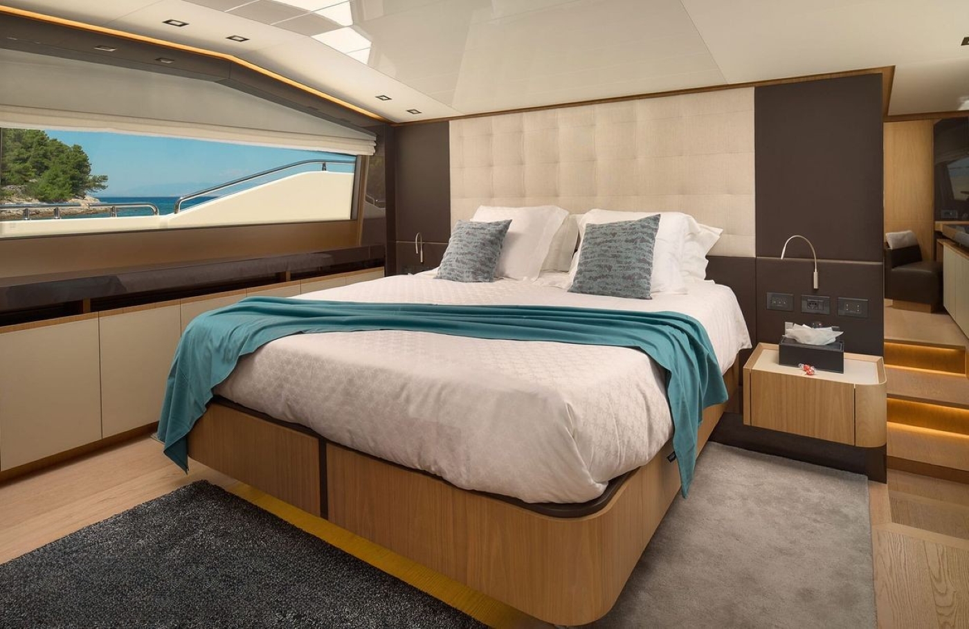 The lounge in the aft port corner provides a chaise-longue, sofa and coffee table for conversation and watching films on the pop-up widescreen TV opposite.