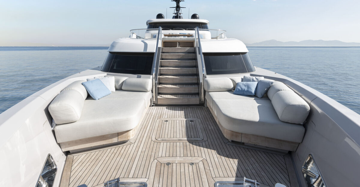 A stairway leads down into the bow section, which has high bulwarks for privacy while guests lounge on the two sofa/sunbeds.