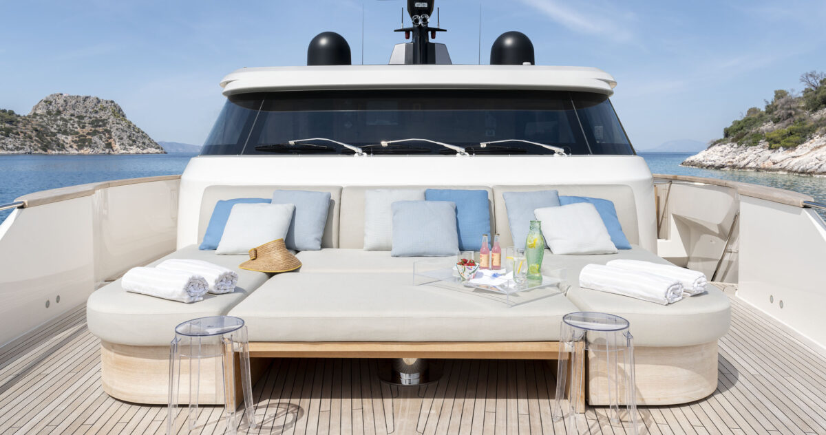 A stairway leads down into the bow section, which has high bulwarks for privacy while guests lounge on the two sofa/sunbeds.