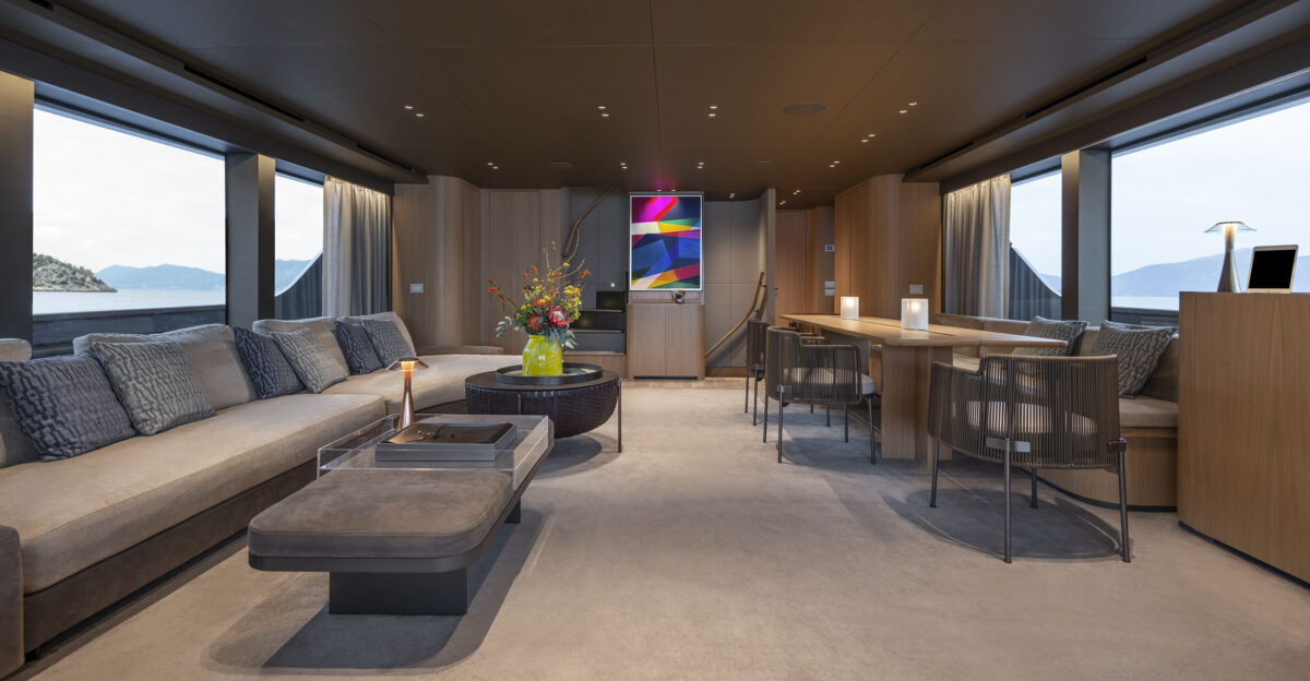Side walkways along the upper deck lead around to the Portuguese deck, where the sunbed converts into a C-shaped sofa with raised table for drinks and casual meals in the sunshine, or beneath a canvas shade.