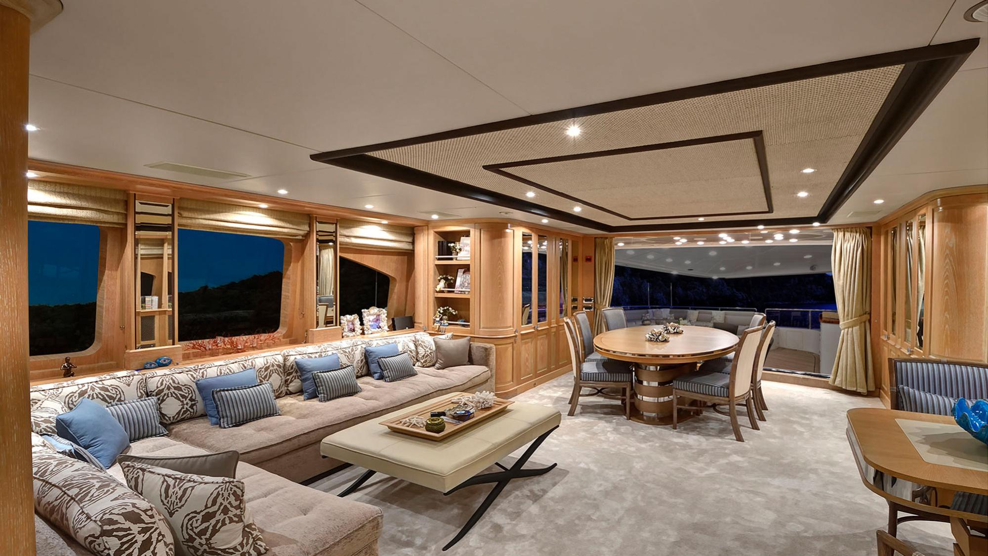 On the main deck, a comfortable salon boasts a large L shaped sofa, coffee table and occasional chairs, perfect for entertaining, with direct access to the shaded aft deck. Above, the bridge deck features a further lounge and formal dining tables, with access to the upper aft deck and alfresco dining.