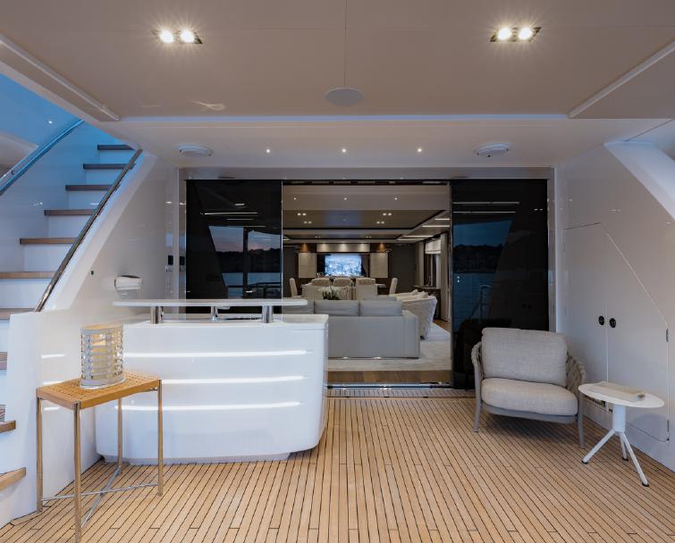 NOTABLE FEATURES OF RIVIERA LIVING: ~Flybridge Jacuzzi ~Abundance of sunbeds ~Refined interiors ~Fold-down terrace ~Top speed of 24 knots ~Draft of just 2.1m/6.11ft for close beach access ~Air ...
