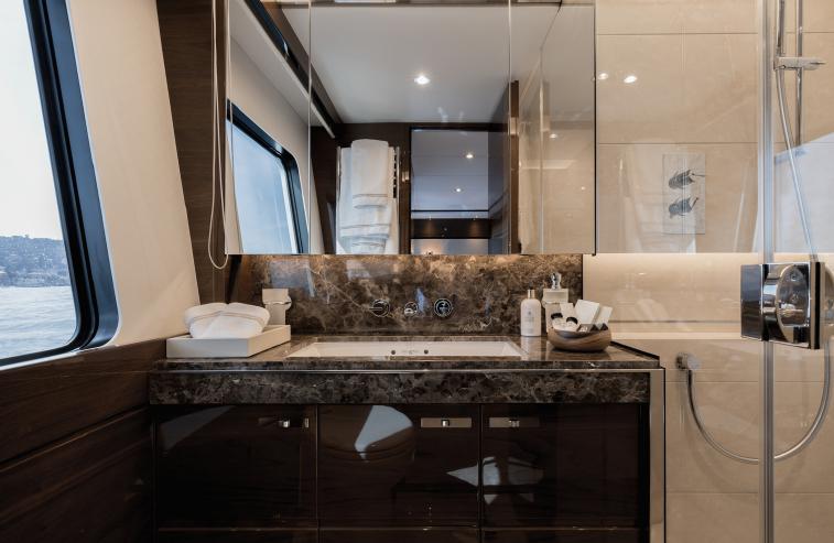 The rest of the salon has ample seating around a central coffee table and a wall-mounted widescreen TV on the aft starboard wall.