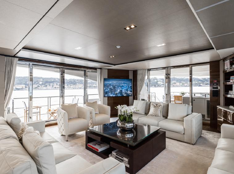 The rest of the salon has ample seating around a central coffee table and a wall-mounted widescreen TV on the aft starboard wall.