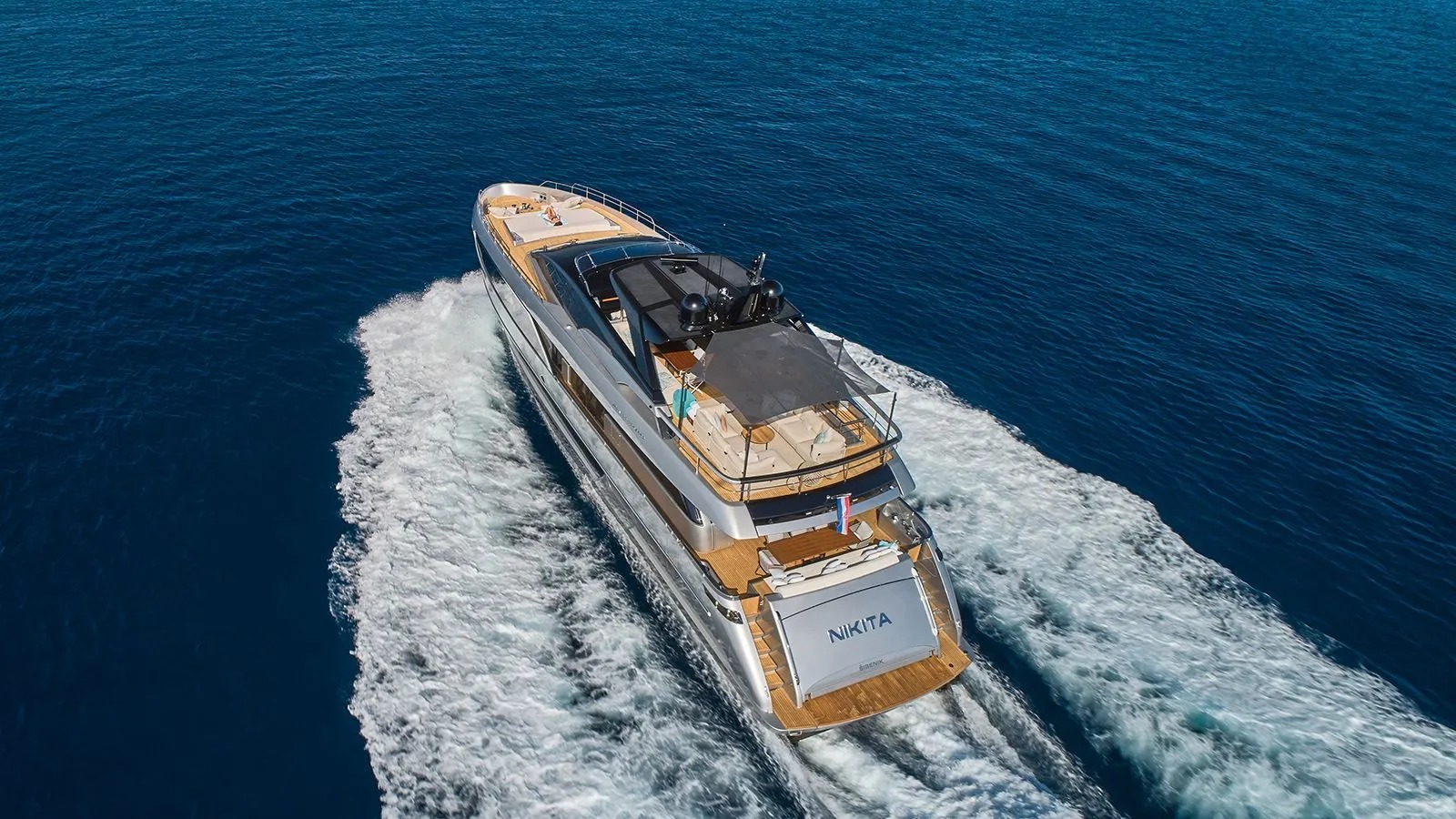NOTABLE FEATURES OF NIKITA: ~Foredeck sunbeds ~Large flybridge lounge ~Full-beam Master suite ~Gym convertible to children's cabin ~Fold-down terrace ~Top speed of 26 knots ~Air conditioning ~Wi-Fi