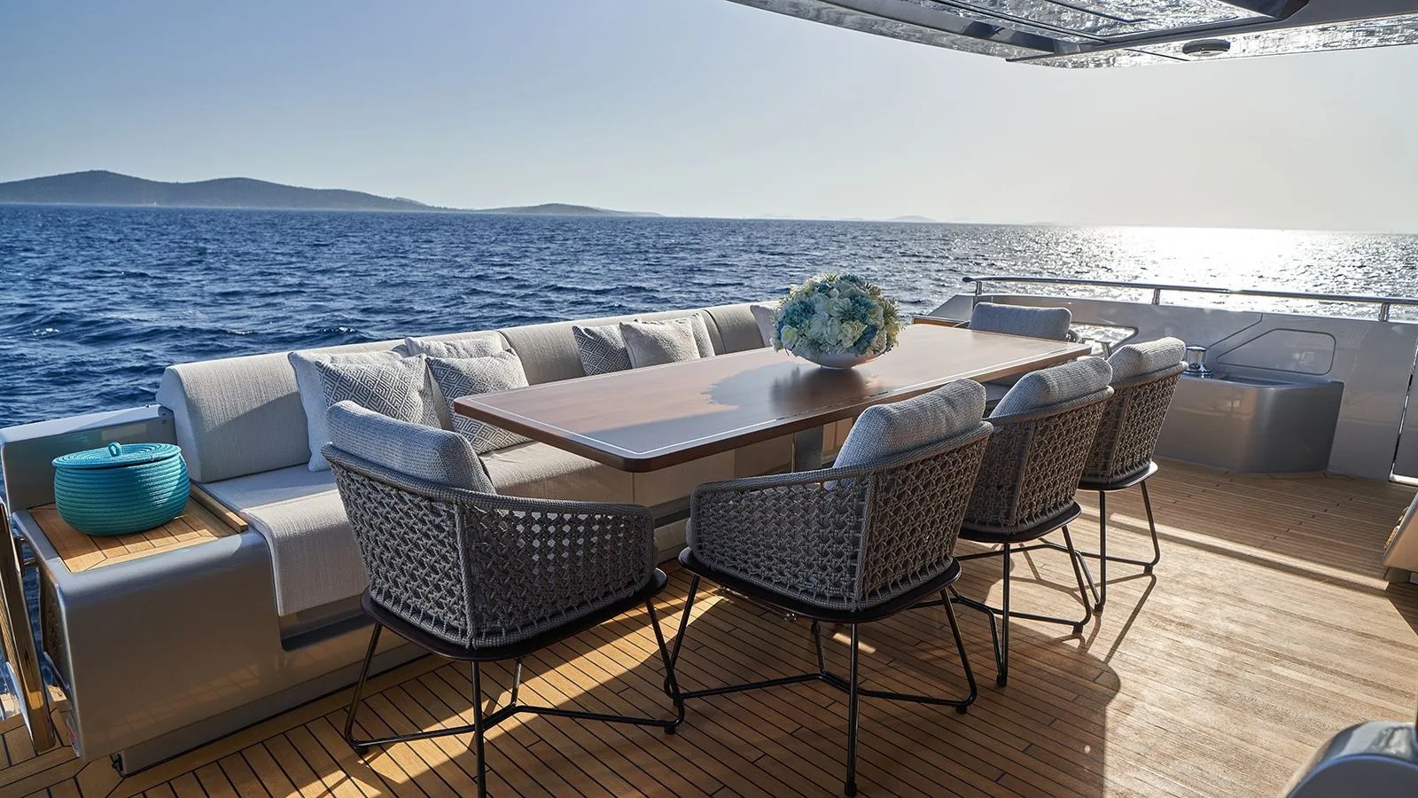 The main deck aft comes with a sofa, table and movable chairs for alfresco lounging and dining in the shade.