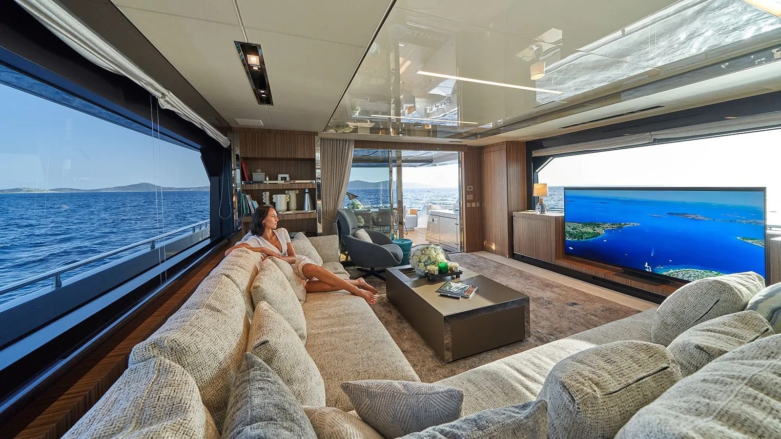 From the main foyer guests can access the raised pilothouse above, and from here a stairway connects up to the flybridge outdoor social area.