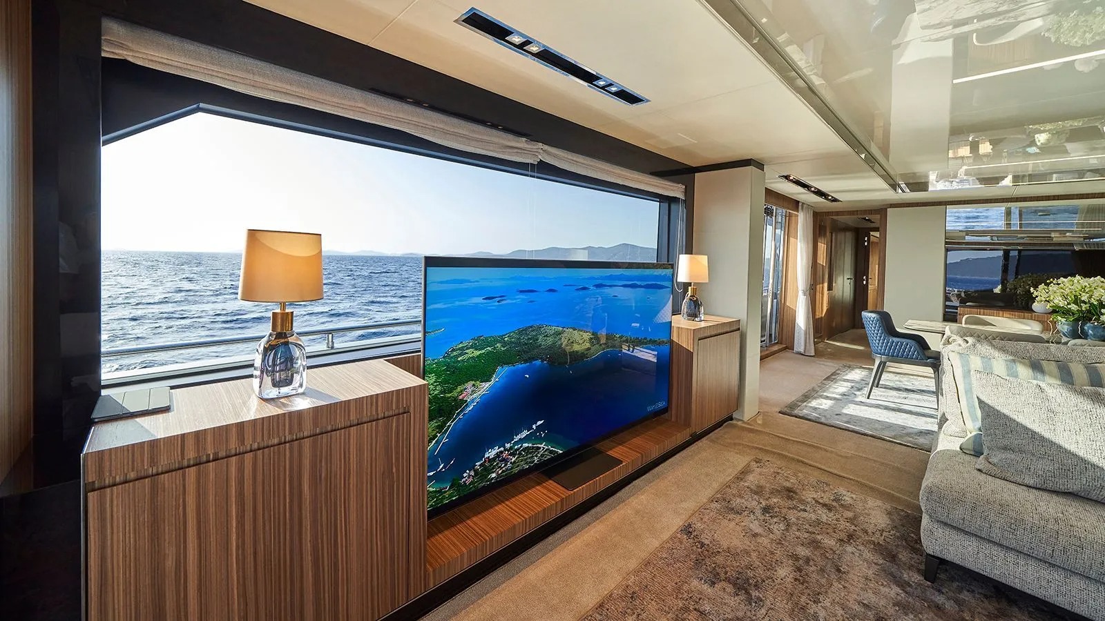 From the main foyer guests can access the raised pilothouse above, and from here a stairway connects up to the flybridge outdoor social area.
