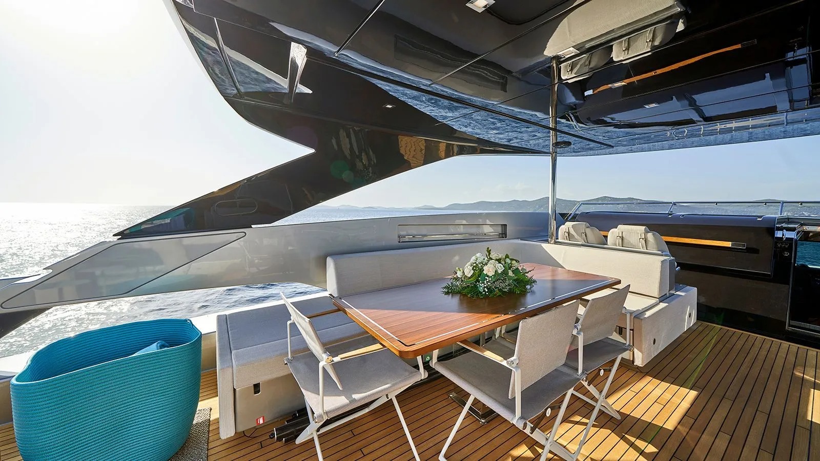 The main deck aft comes with a sofa, table and movable chairs for alfresco lounging and dining in the shade.