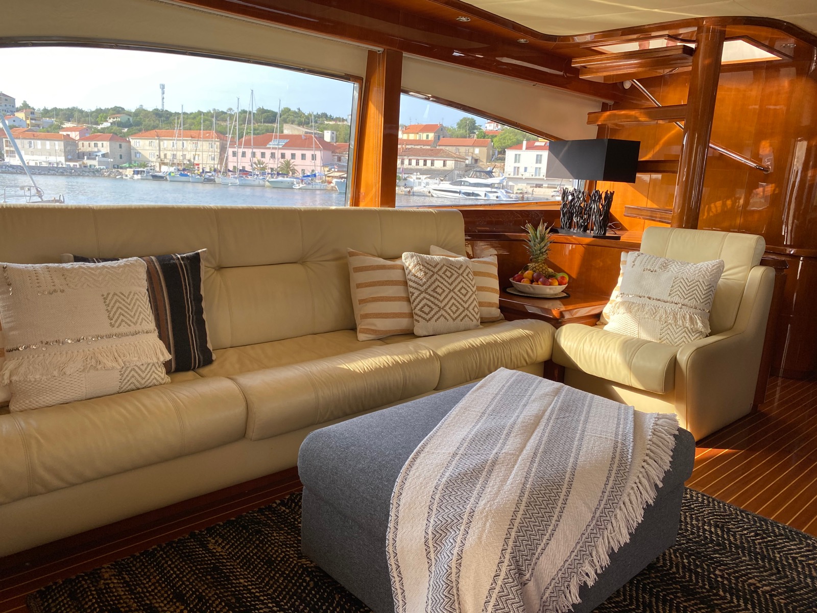 The main salon has wide windows filling the space with light and is configured with a lounge space aft and a forward dining setting.