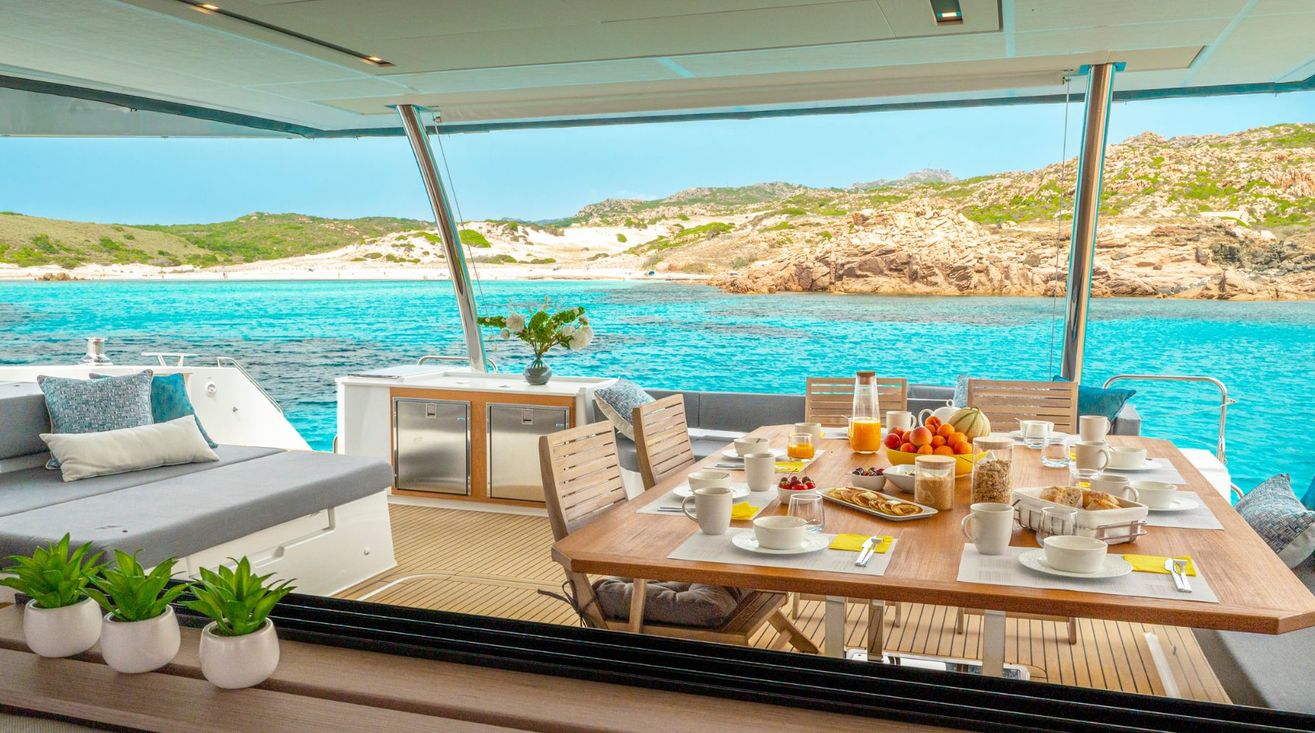 Finally, the expansive cockpit is reminiscent of a beach club terrace; a lovely dining setting under the shelter of the flybridge, sunpads and sofas and gentle curved steps either side down to the swim platform. The clear open views from three sides mean guests can relax and appreciate their beautiful surroundings.