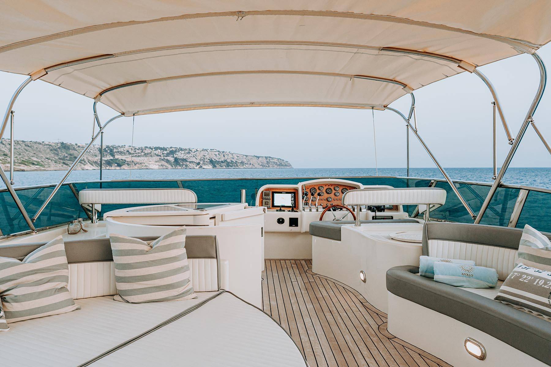 The flybridge is the perfect location to kick back and relax, enjoy a leisurely lunch at the round dining setting, sunbath on the luxury sunpads or chat to the captain at the helm station. The deck boasts a retractable bimini offering a choice of full sun or shade during the hottest times of day.