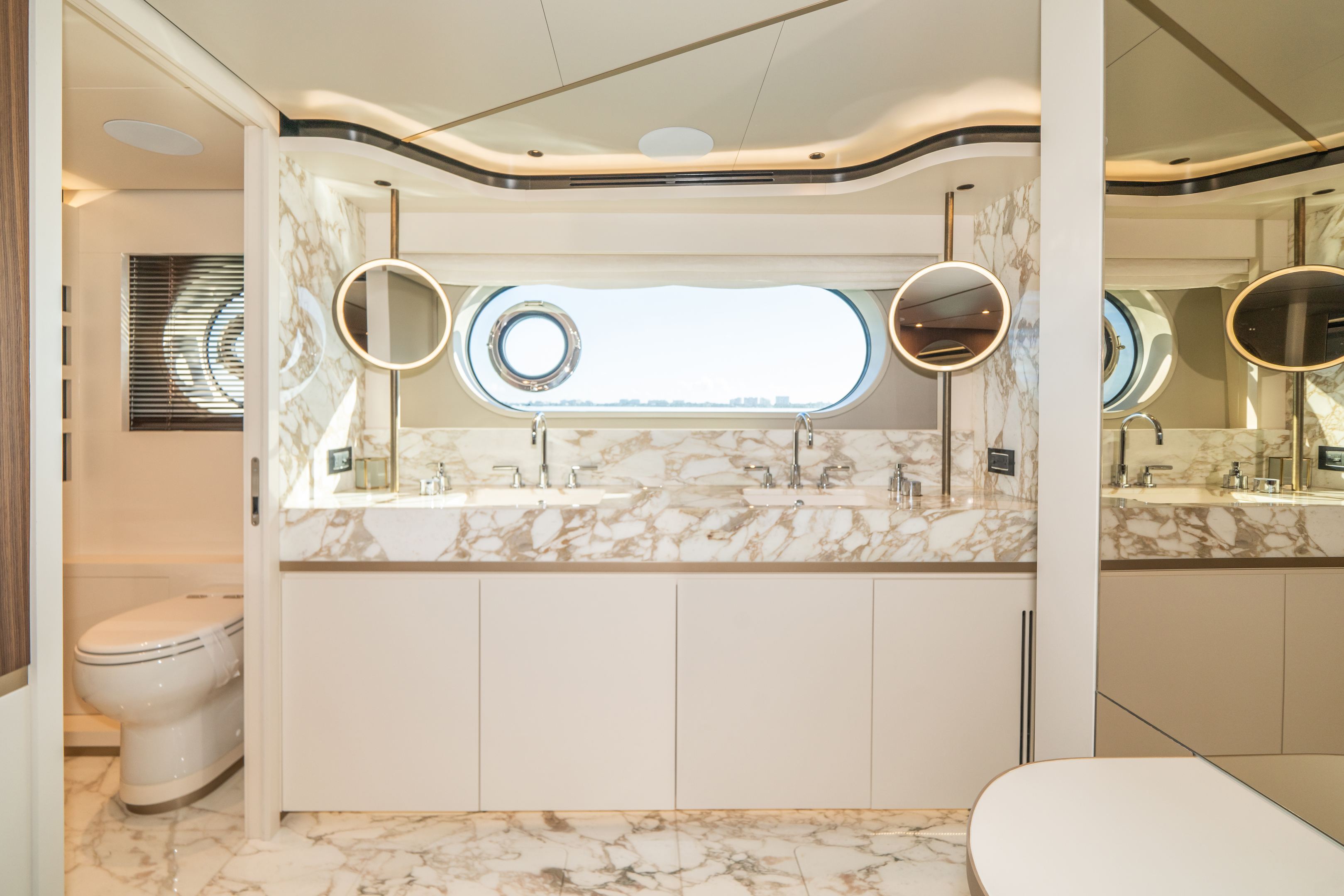 The aft lounge space offers guests a relaxing haven while the forward formal dining salon has seating for up to eight guests.