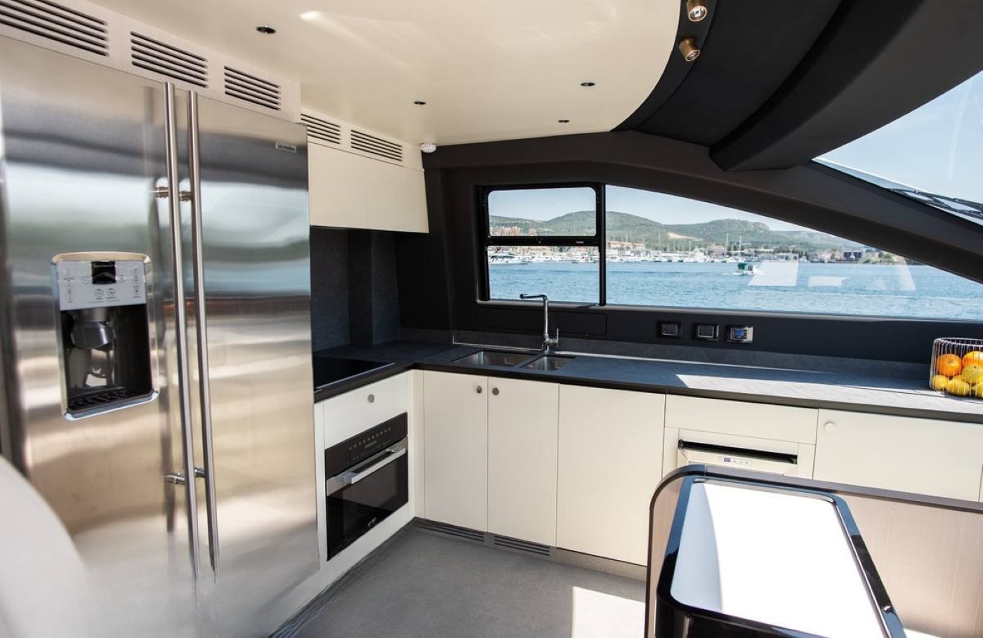 . Her sociable flybridge offers the perfect position for guests to have a drink at the bar, enjoy a delicious lunch at the dining setting or chill out on the sunpads and sofas. A forward helm station allows the captain to be on hand to share local knowledge with the guests.