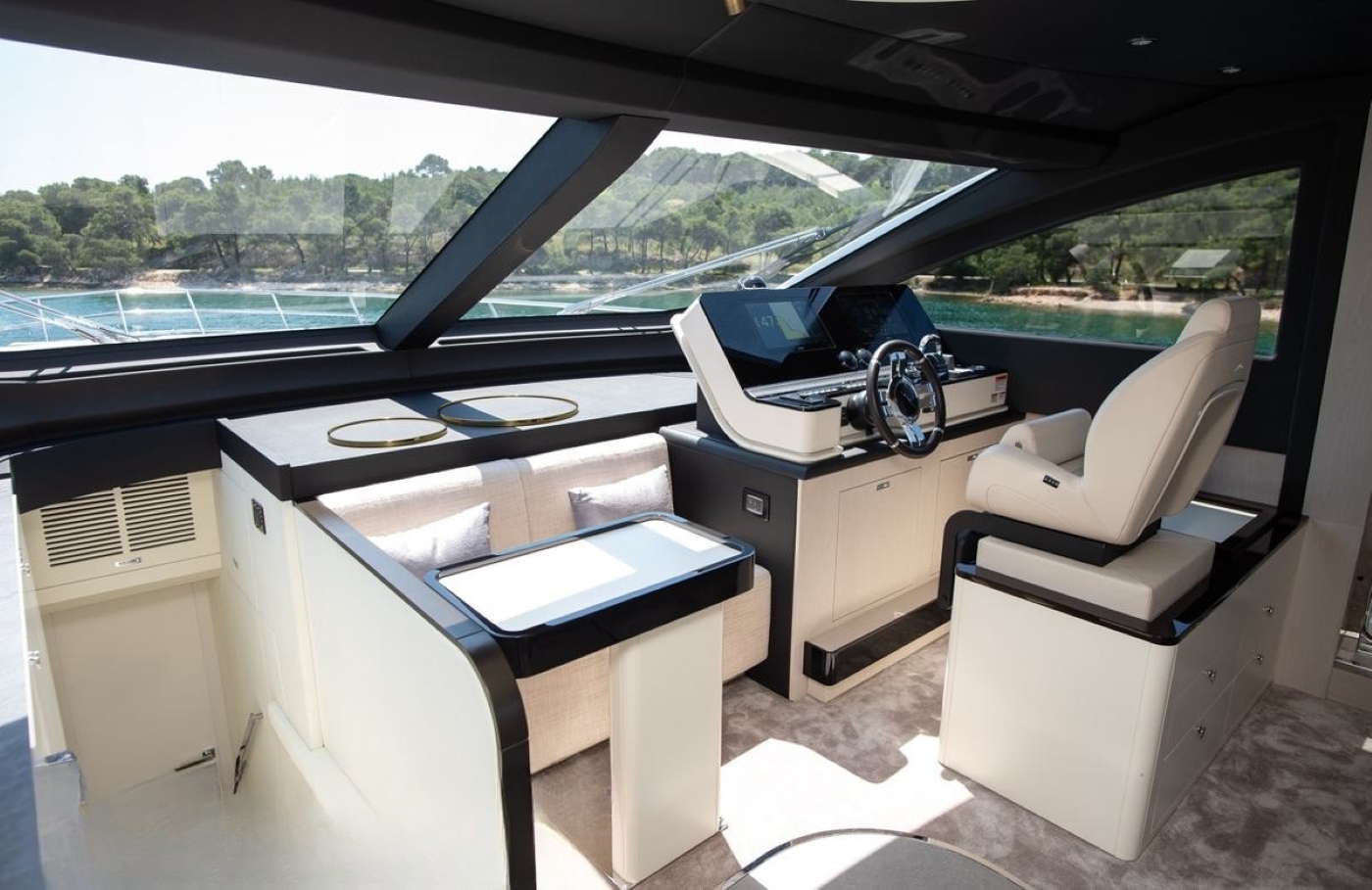 The neutral soft furnishings and plush carpets and sofas make for a comfortable haven for guests. A more formal indoor dining area is forward in the space. The forward crew area on the main deck is screened off for privacy and ...