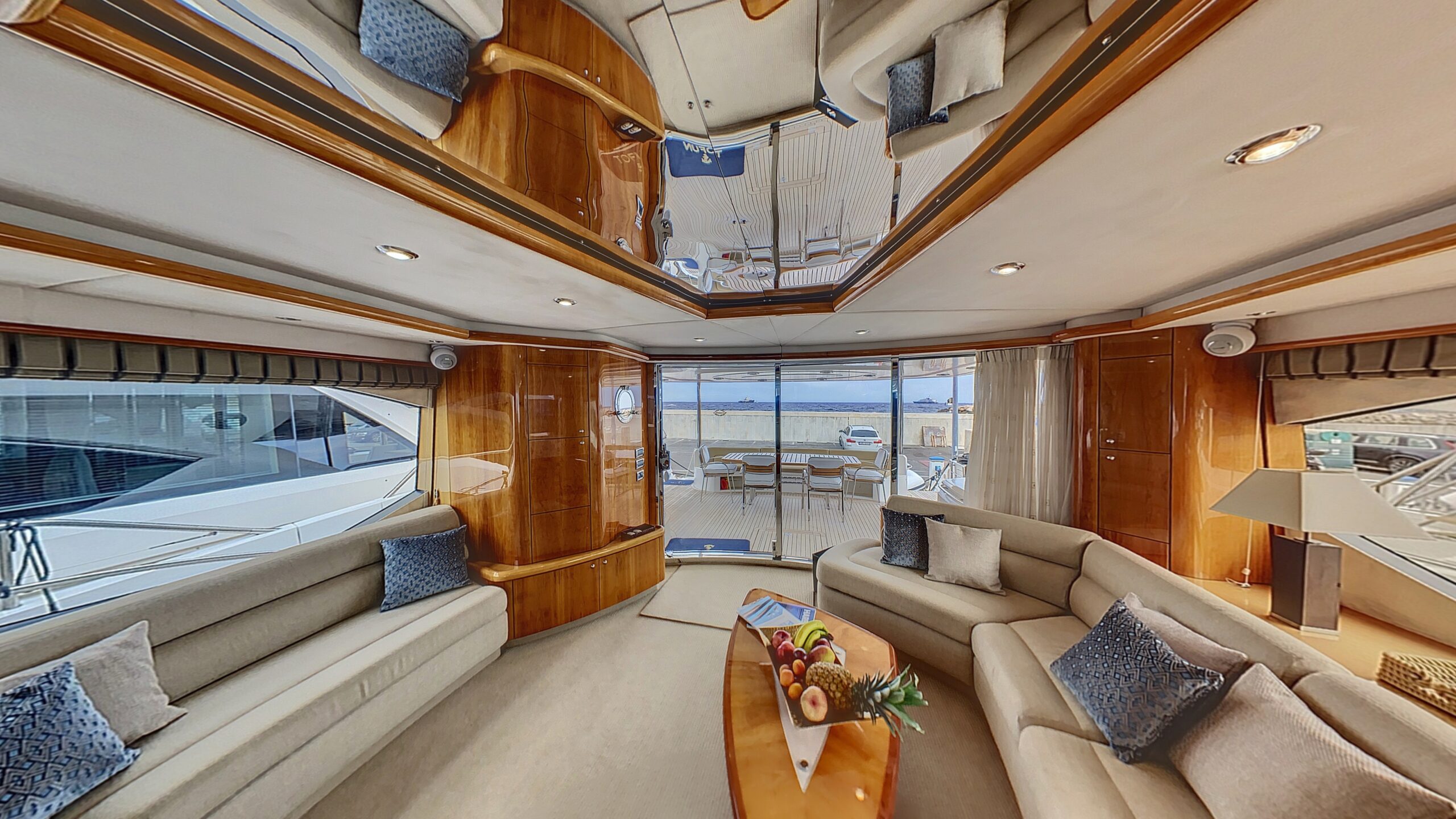 The main salon comprises a spacious lounge aft with a formal dining room and open bar /galley plus helm controls forward.