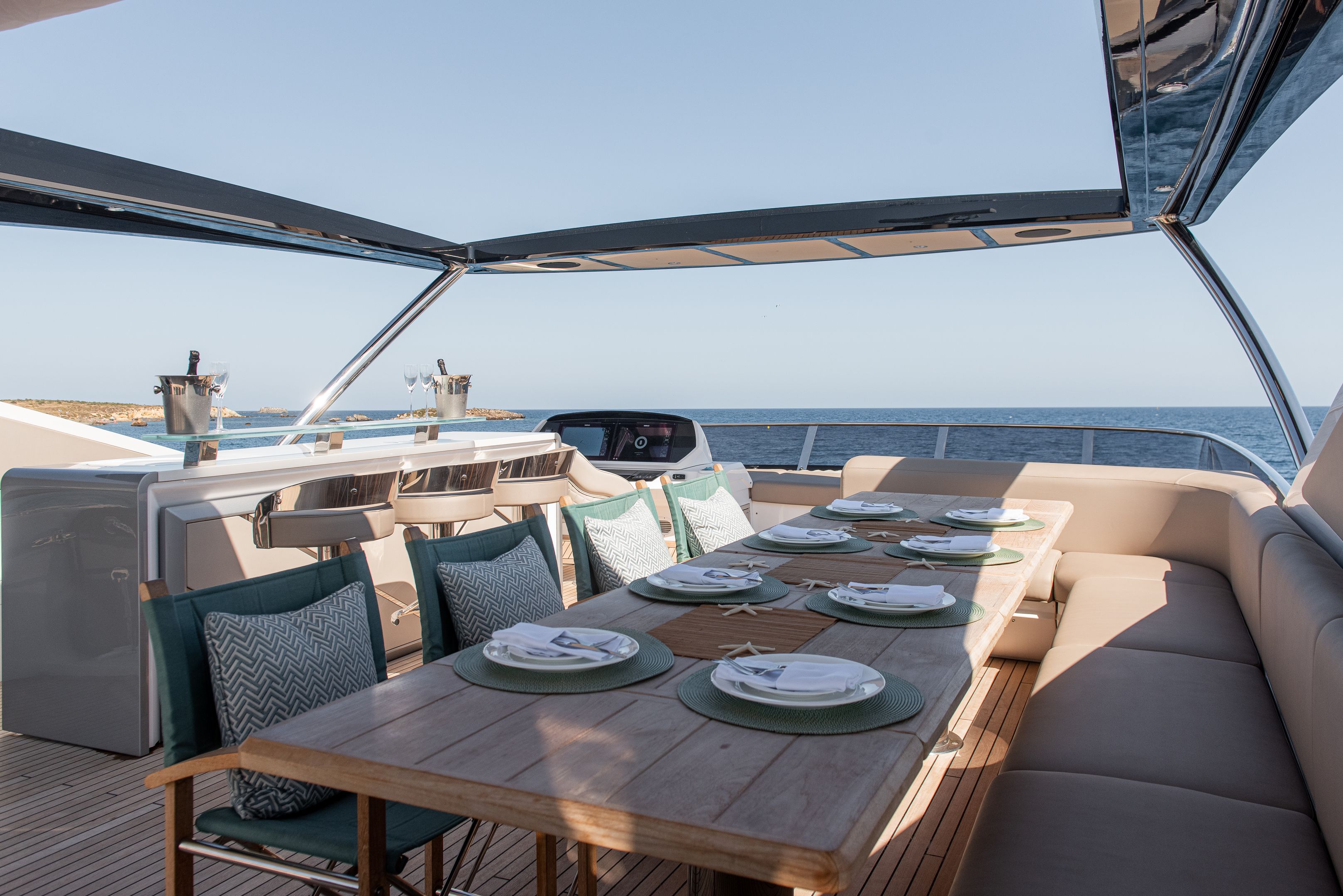 The sun deck on the flybridge boasts a u-shaped sofa sheltered dining setting and bar. The foredeck makes the most of the wide beam to offer sunpads and three long bench sofas. Here guests can enjoy the far-reaching views out to the bow while sipping a cocktail.