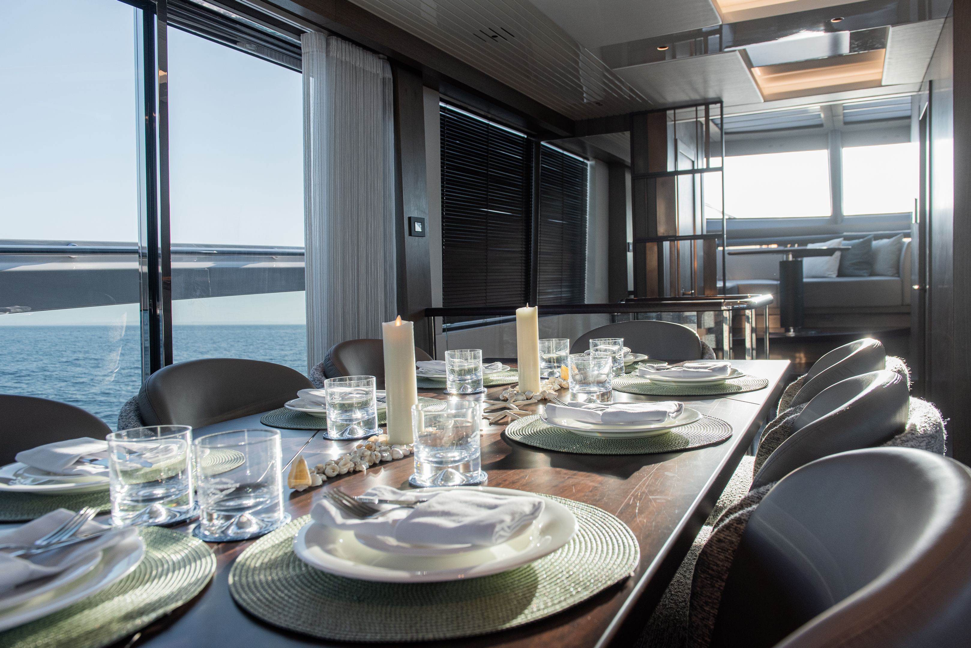 The sun deck on the flybridge boasts a u-shaped sofa sheltered dining setting and bar. The foredeck makes the most of the wide beam to offer sunpads and three long bench sofas. Here guests can enjoy the far-reaching views out to the bow while sipping a cocktail.