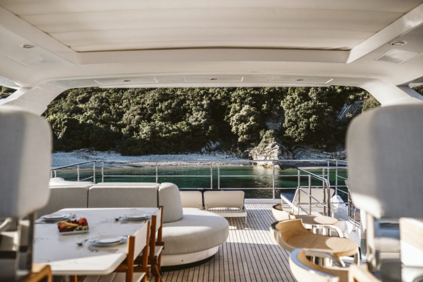 The stunning flybridge sun deck is a sociable area which guests can utilise all day and into the evening featuring luxury sofas, a flexible dining table, a full bar, sun loungers and forward bench seats shaded by a hard top with ...