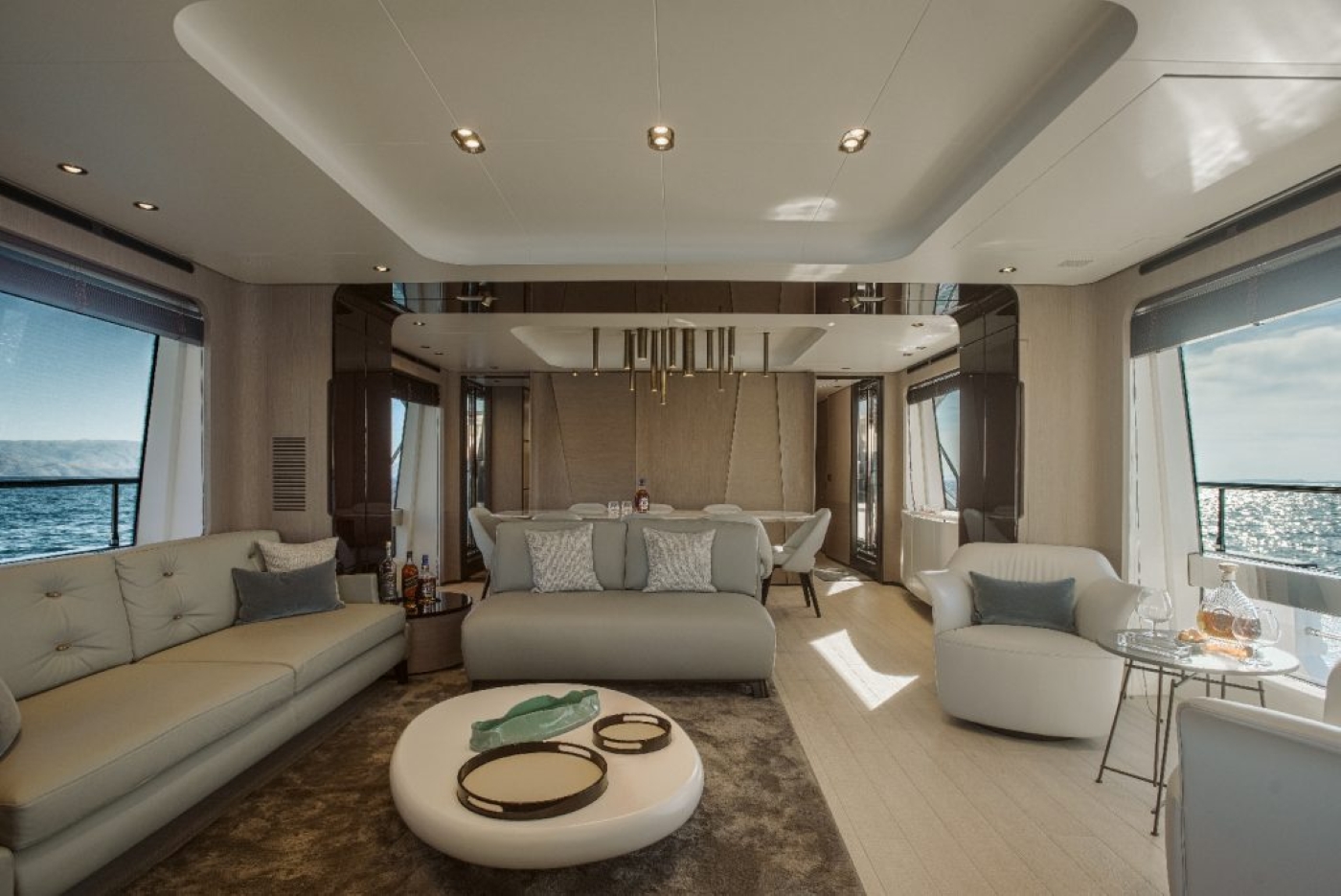 Forward in the main salon is a formal dining space with panoramic views from the large windows.