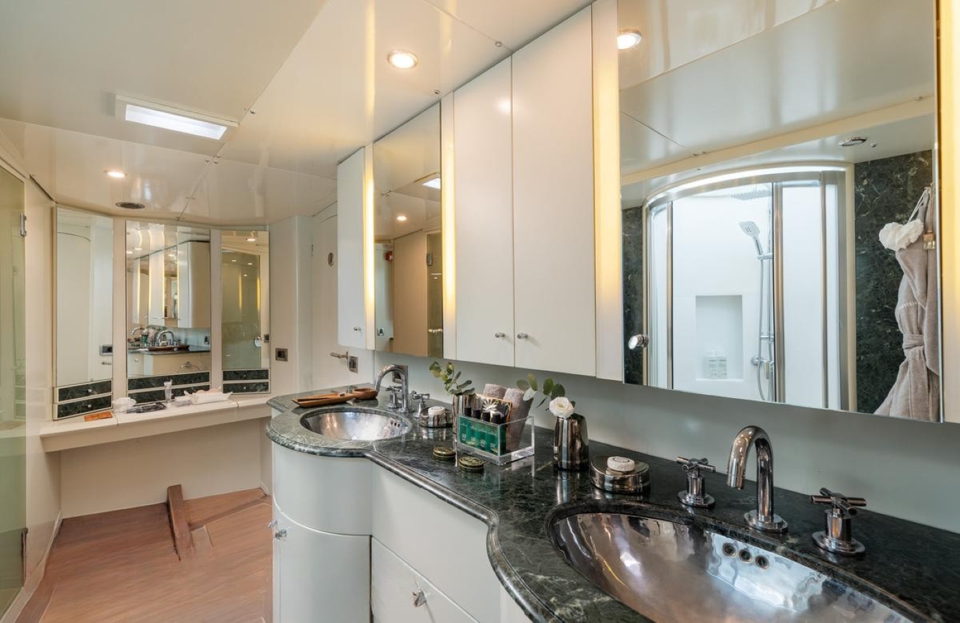 All the cabins benefit from the luxury and privacy of ensuite bathroom facilities. They are light and bright thanks to the portholes, light wells, elegant lighting, and neutral décor. The primary charter guests will be delighted by the spacious master and its generous bathroom with double vanity, lounge area and desk space.