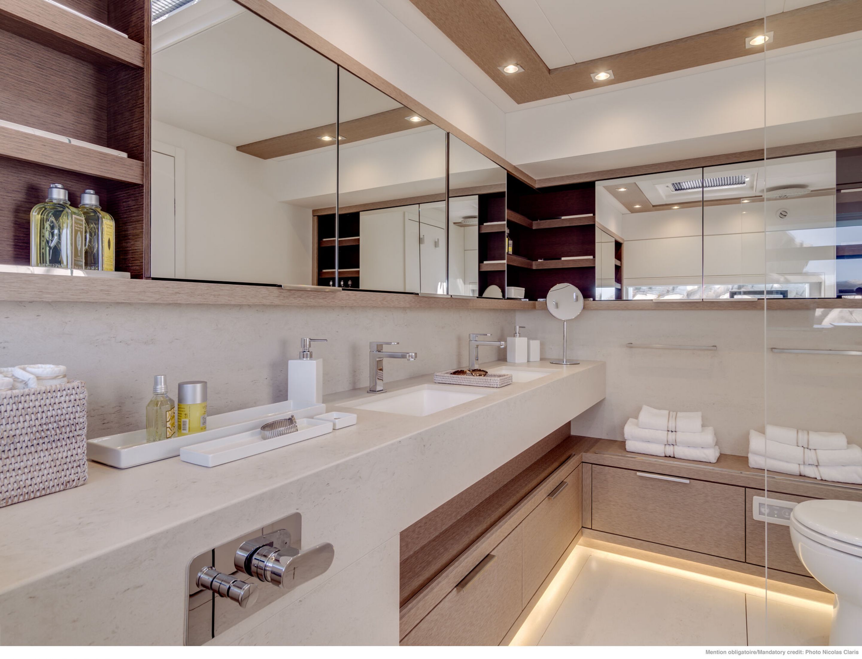 There are two additional suites, and all the cabins benefits from neutral contemporary interior design with clever storage space and private ensuite bathroom facilities.