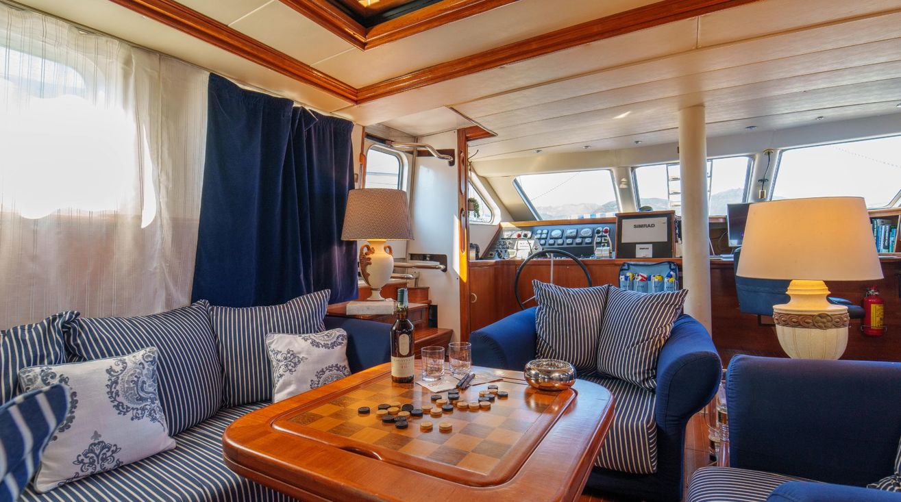 The interior reflects the yacht’s history and preserves the classic ambiance, with a main salon offering comfortable sofas and a relaxed curved dining setting.