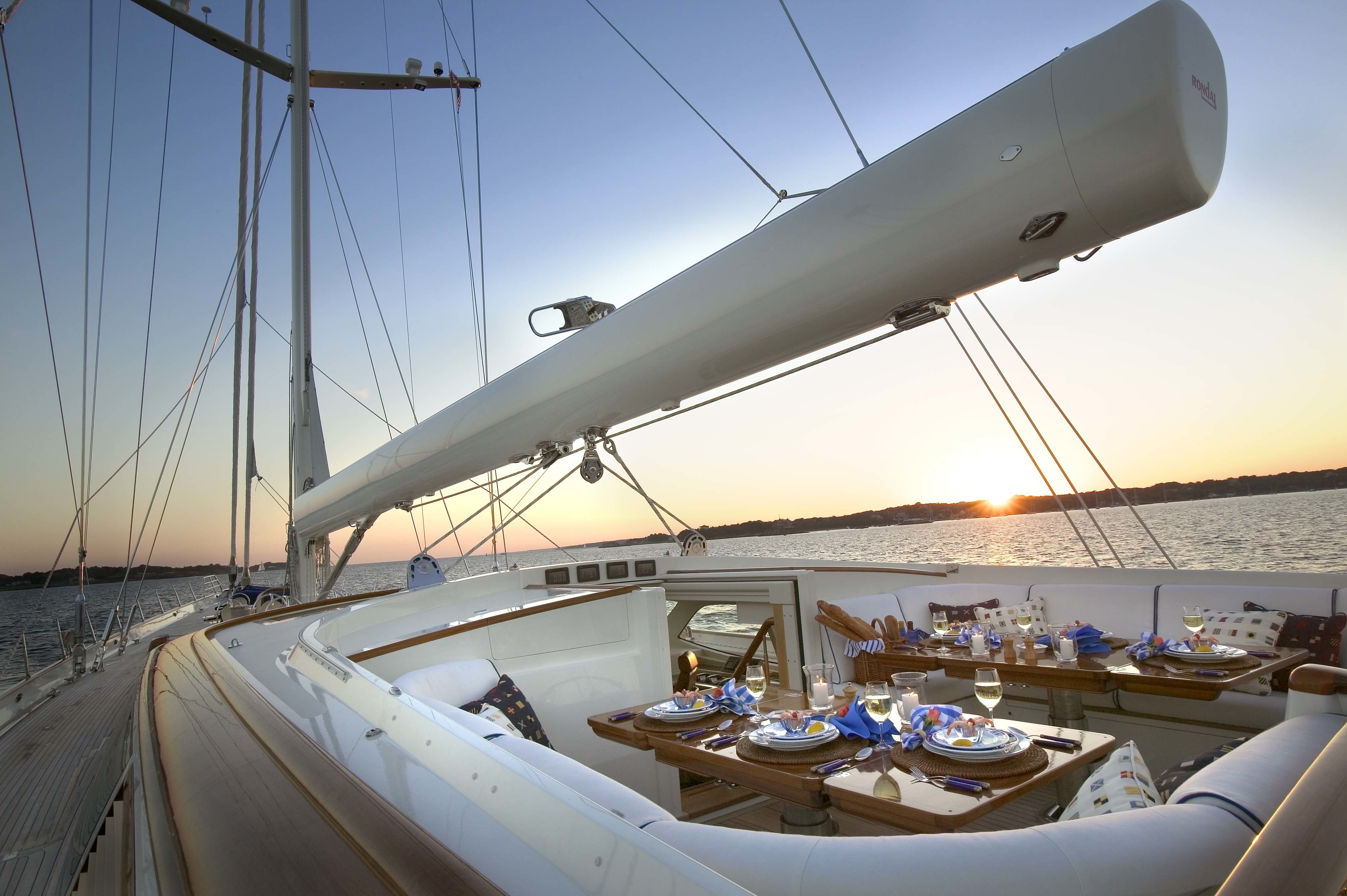 Two large tables in the main cockpit are a favourite place for sheltered dining. A second cockpit further aft creates a private gathering spot just a few steps up from the master suite.