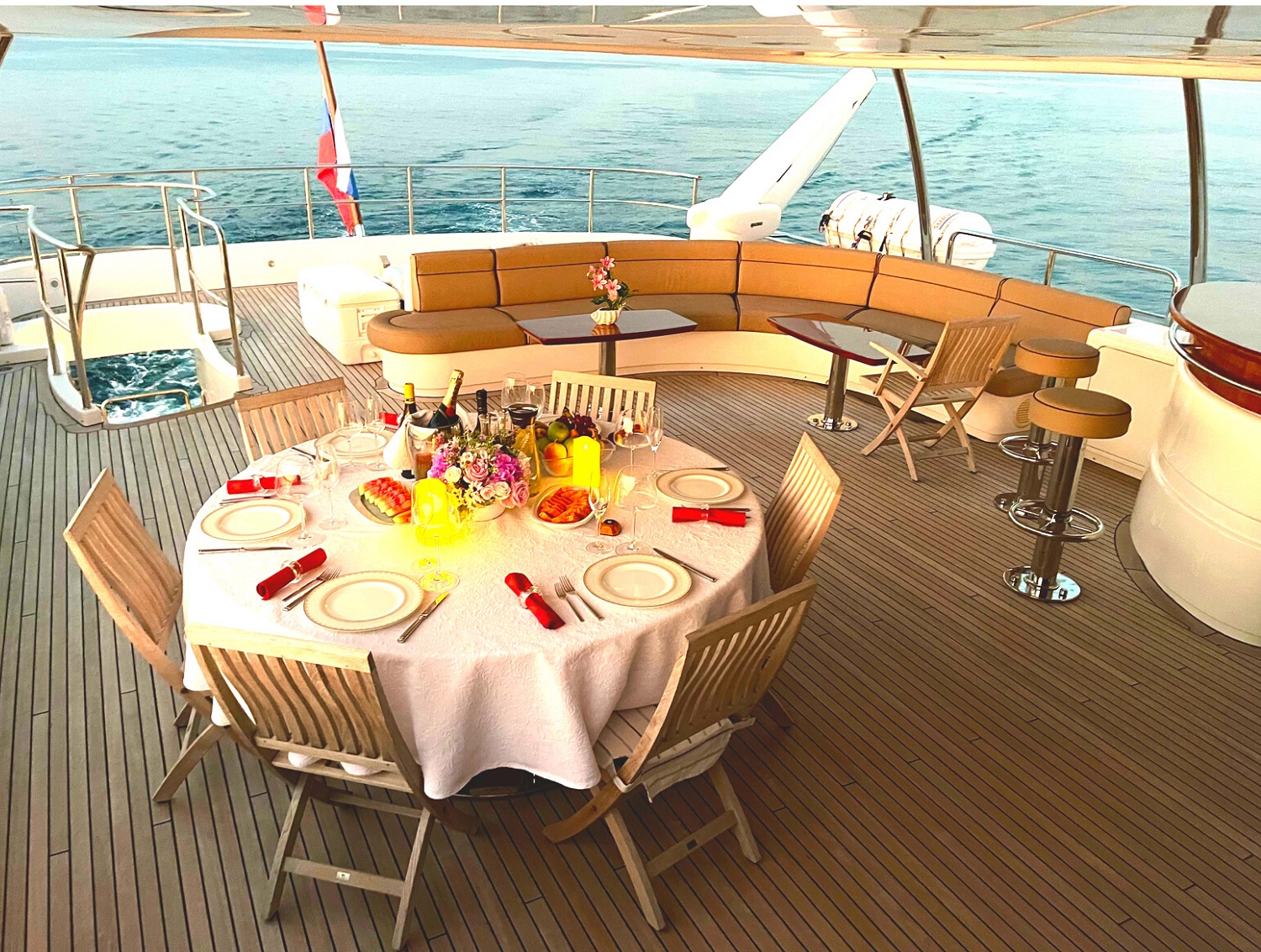 The flybridge features a sunbathing and seating area, while the upper aft deck hosts a fully equipped wetbar and dining table. The main deck aft also features a wonderful dining and seating area, so guests are spoilt for choice when it comes to al fresco living and dining.