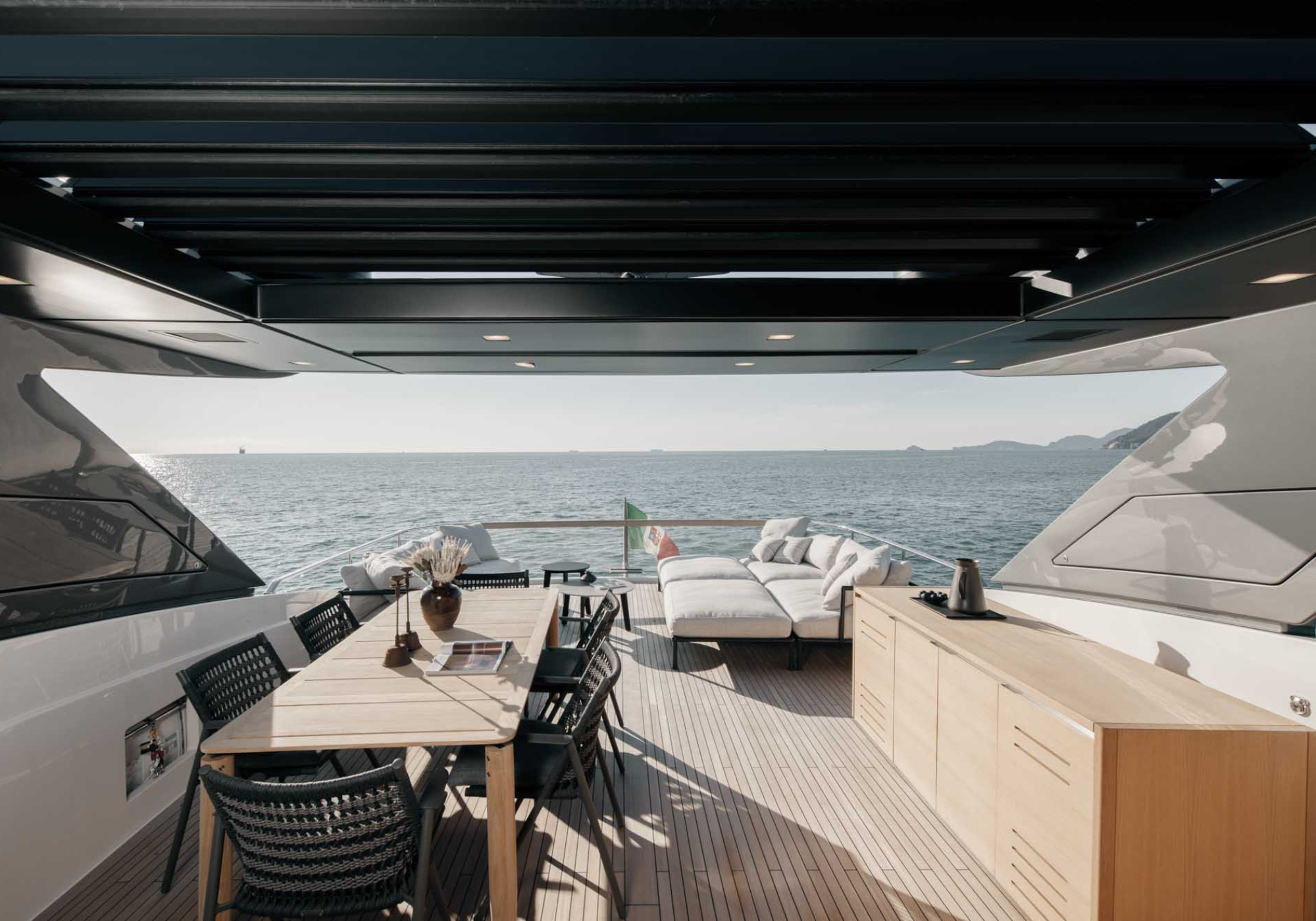 The bridge deck aft is covered by the sundeck overhang and provides a place for alfresco dining in the shade. A set of steps leads up to the helideck, which when clear can be used as an additional social space with panoramic views of the surroundings.