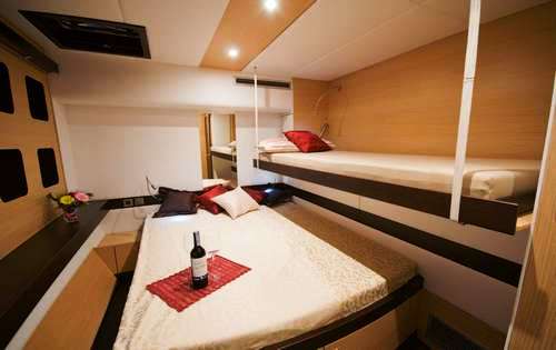 Luxury 2008 Sunreef 70 Catamaran BLUE GURU can accommodate 8 to 12 guests in 5 cabins, two of which can easily be converted into triples. She is available for yacht charters in the Mediterranean and Caribbean. During the summer, she is based in the beautiful Island of Palma de Mallorca and is legal to charter in Spanish waters.